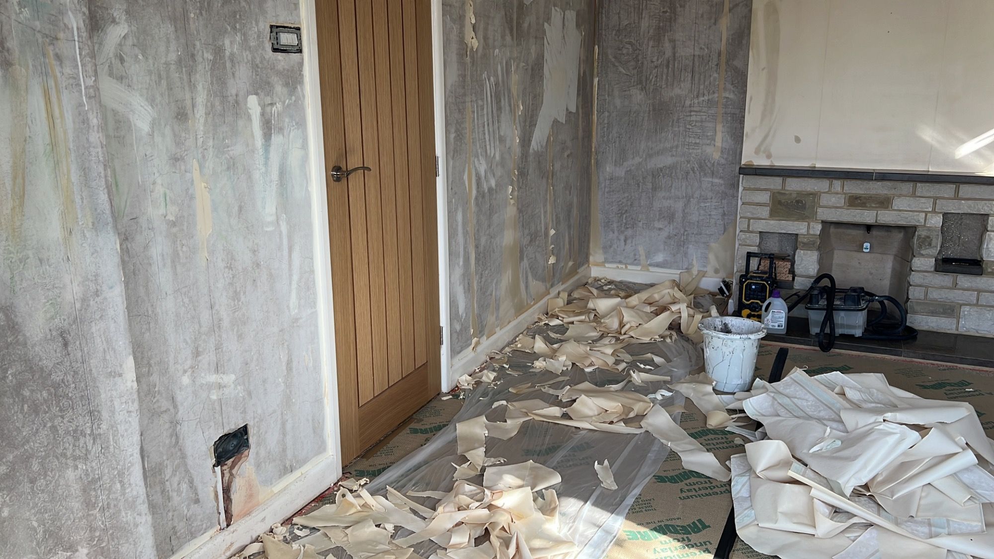 Wallpaper removal and resurface walls as well as installation of fresh wallpaper.